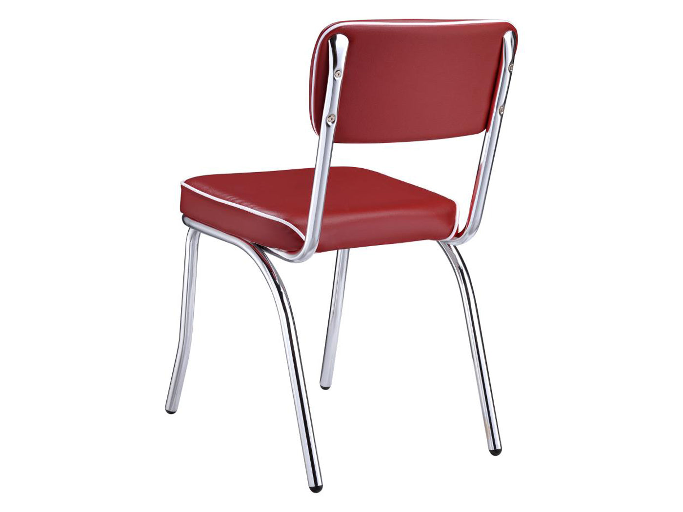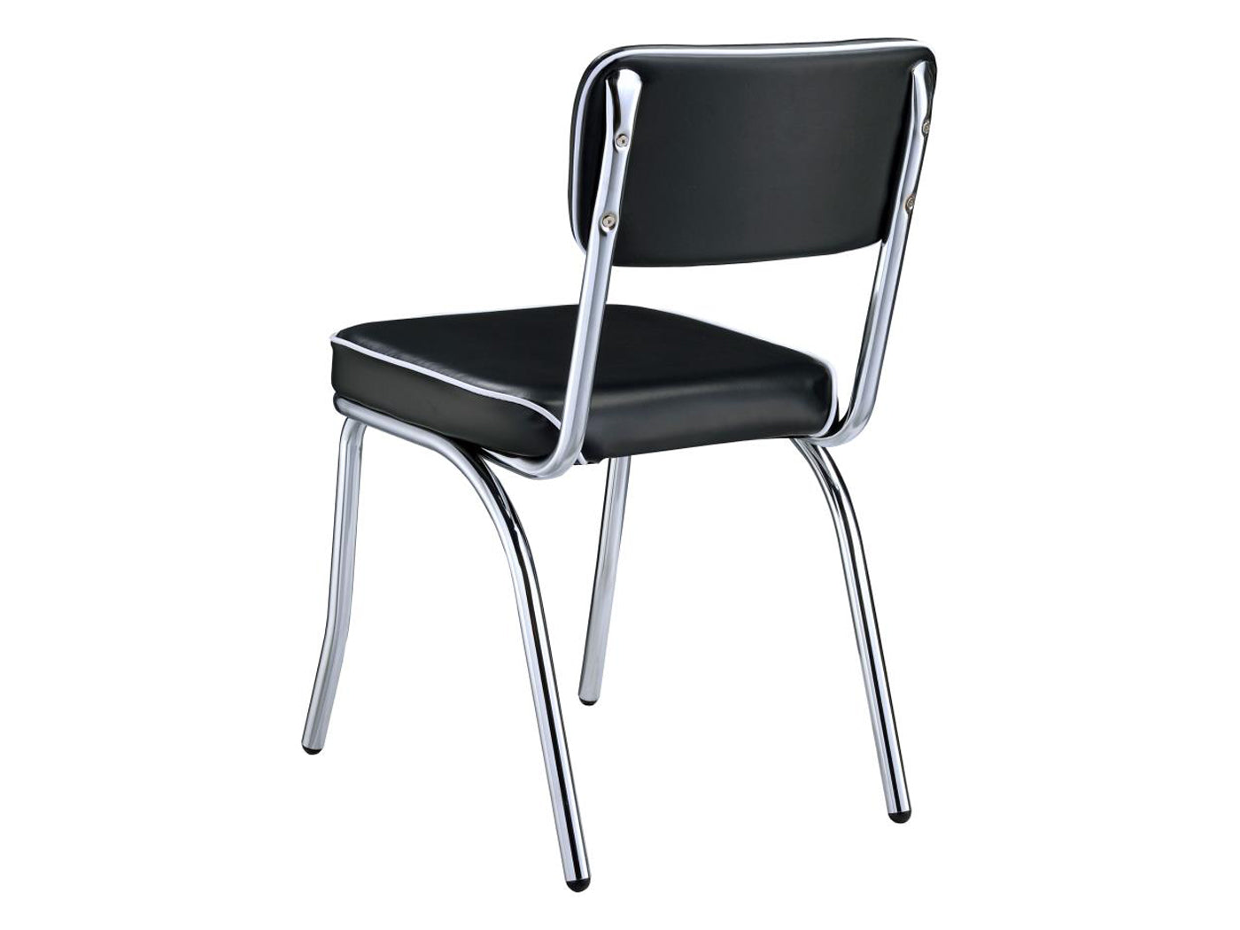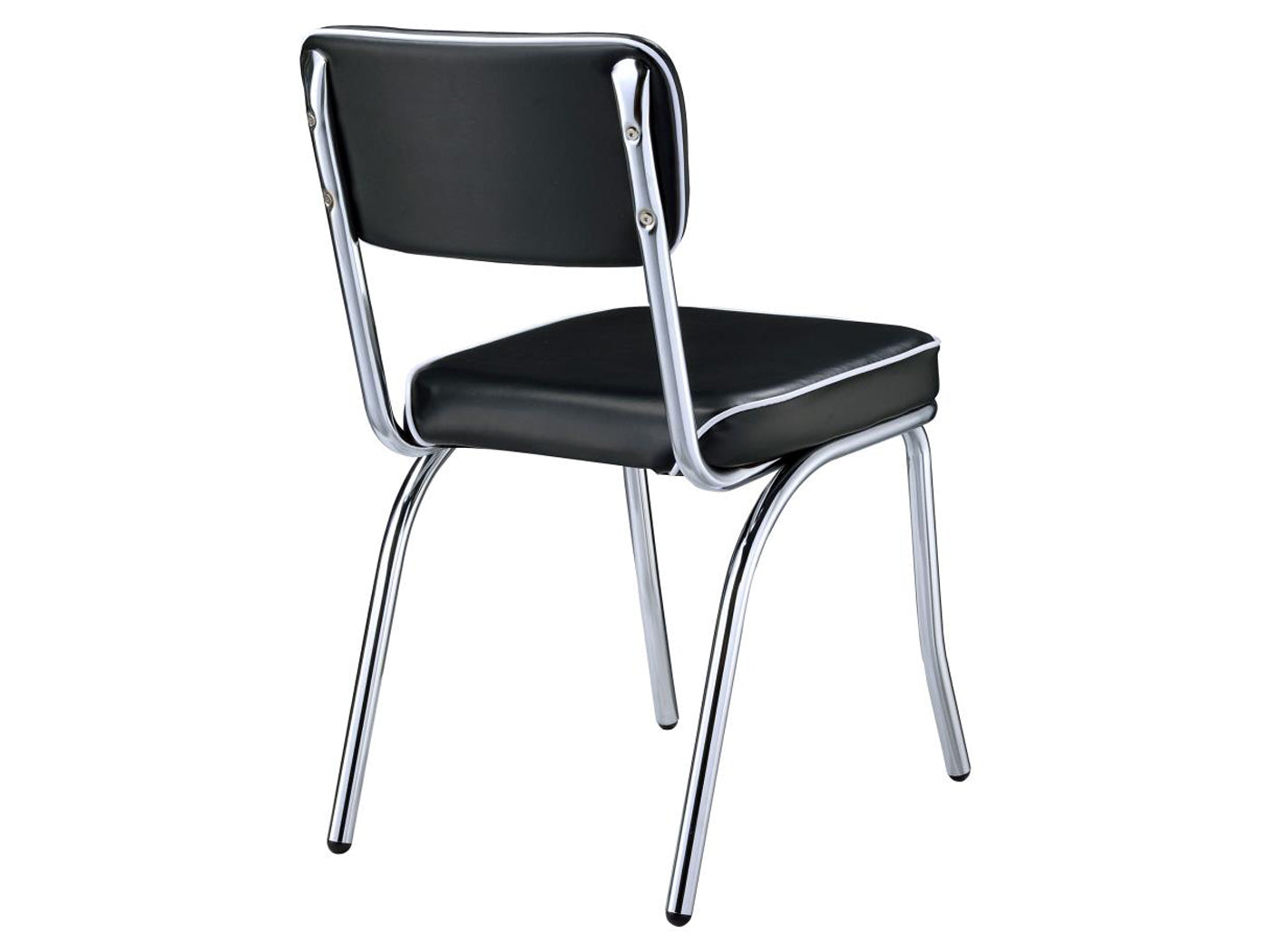 - Travel back in time with a classic round dining table featuring a metal ellipse edge profile and shiny top, a decadent flared metal base, and coordinating chairs with fabric upholstery, thick seat cushions, and slender backs with piping details
