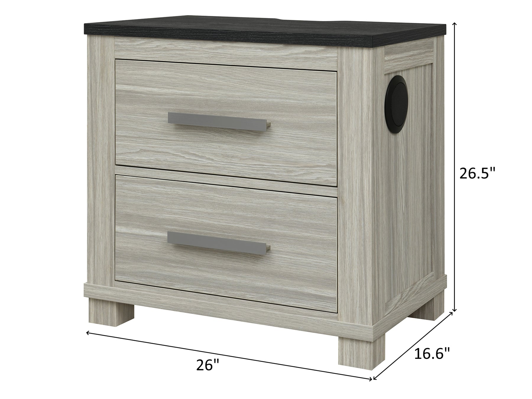 The nightstand has a built-in speaker and a USB charging port.