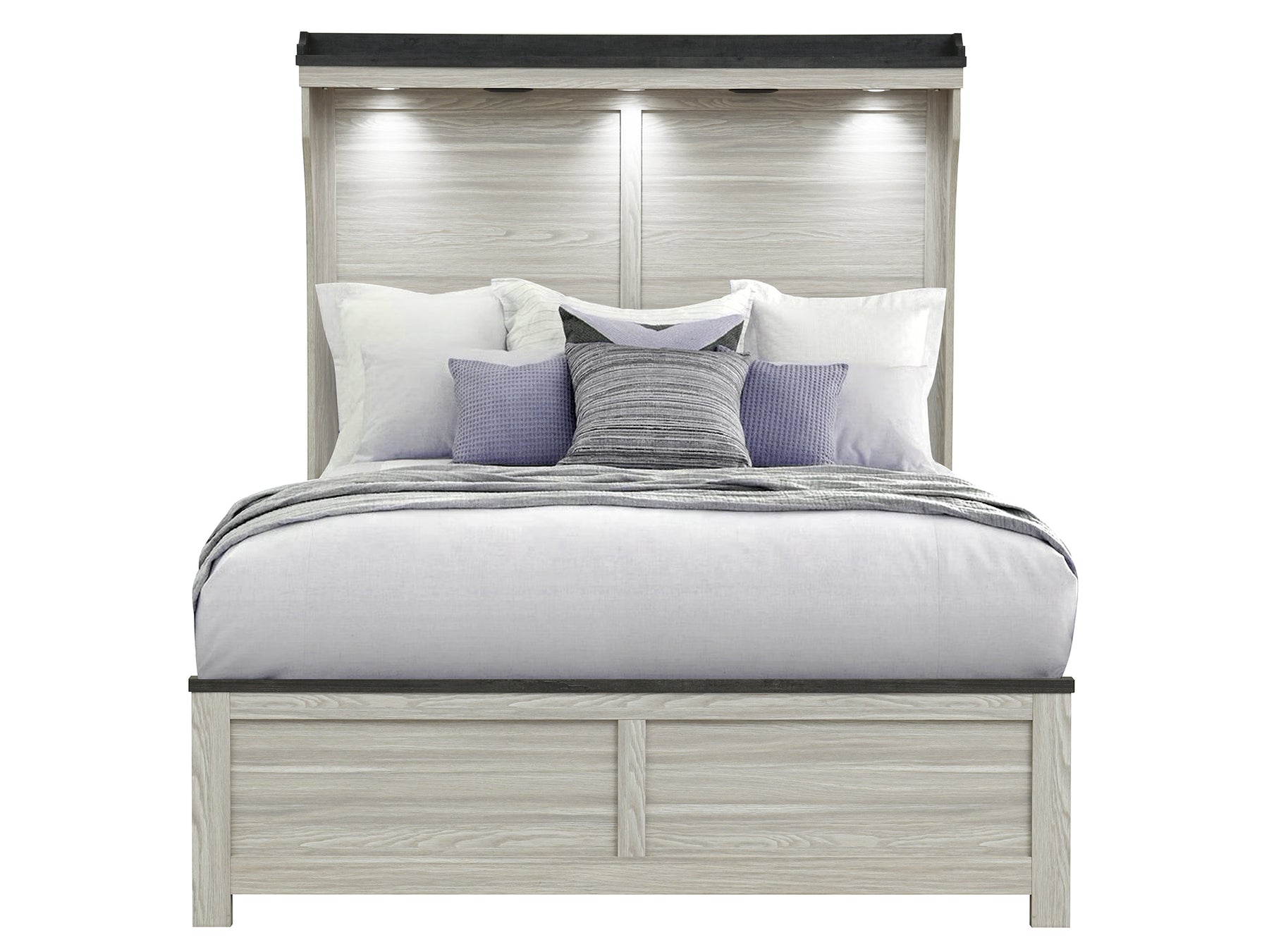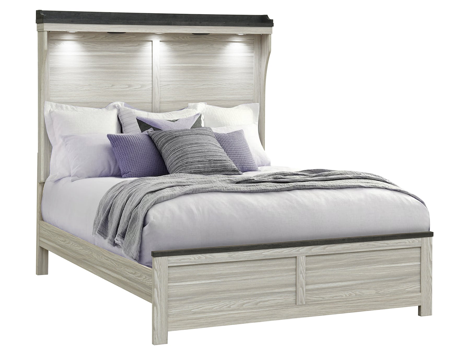 The bed has built-in headboard lights, Bluetooth speakers, and USB charging ports.